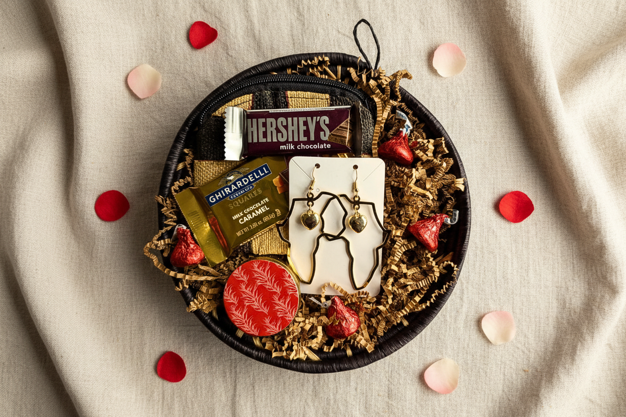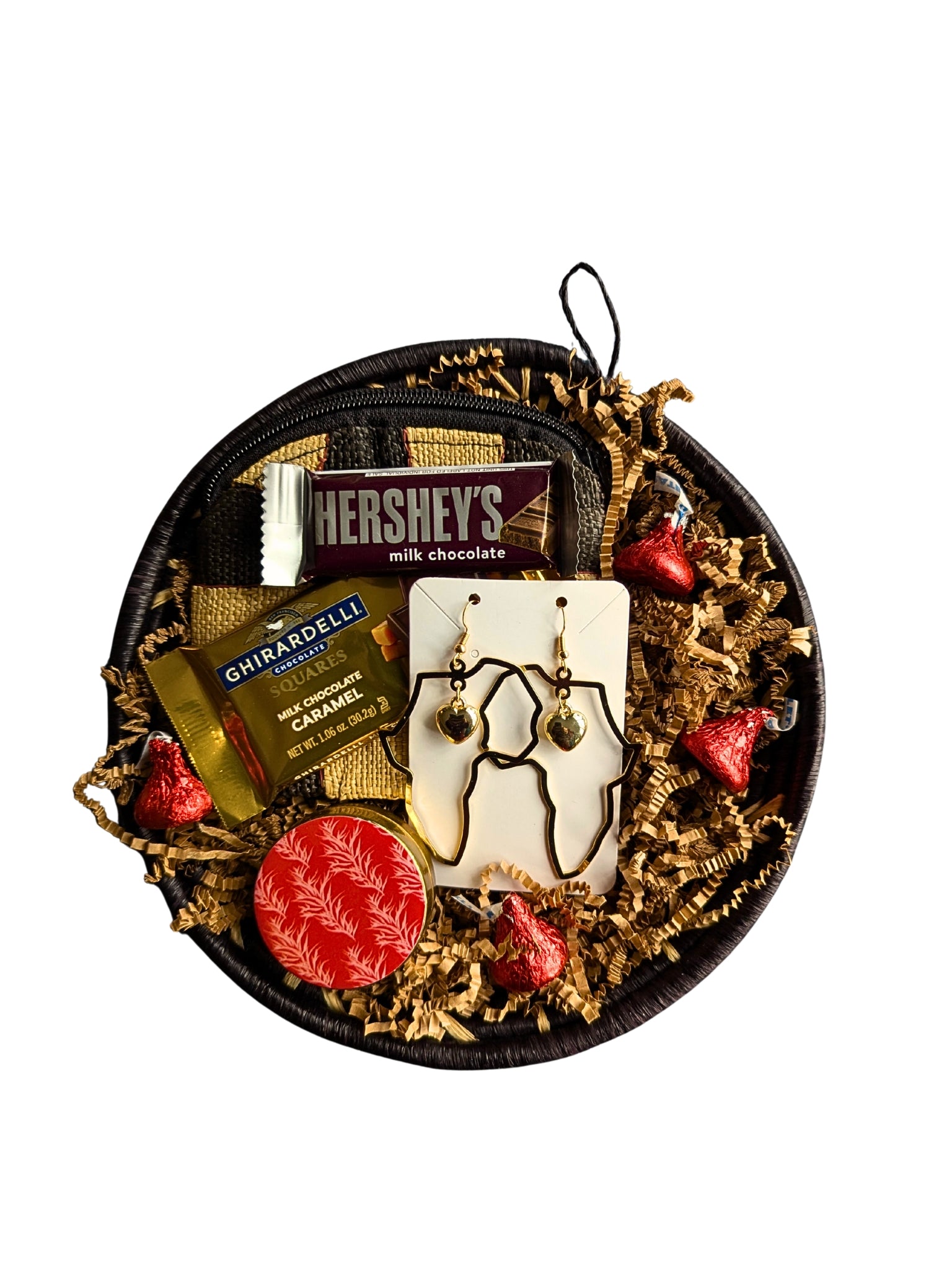Round valentines day gift basket with chocolates, Africa earrings, and a coin purse.