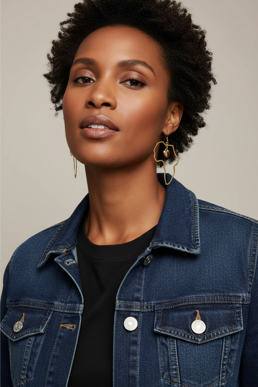 Woman wearing a denim jacket and Africa-shaped earrings on a neutral background