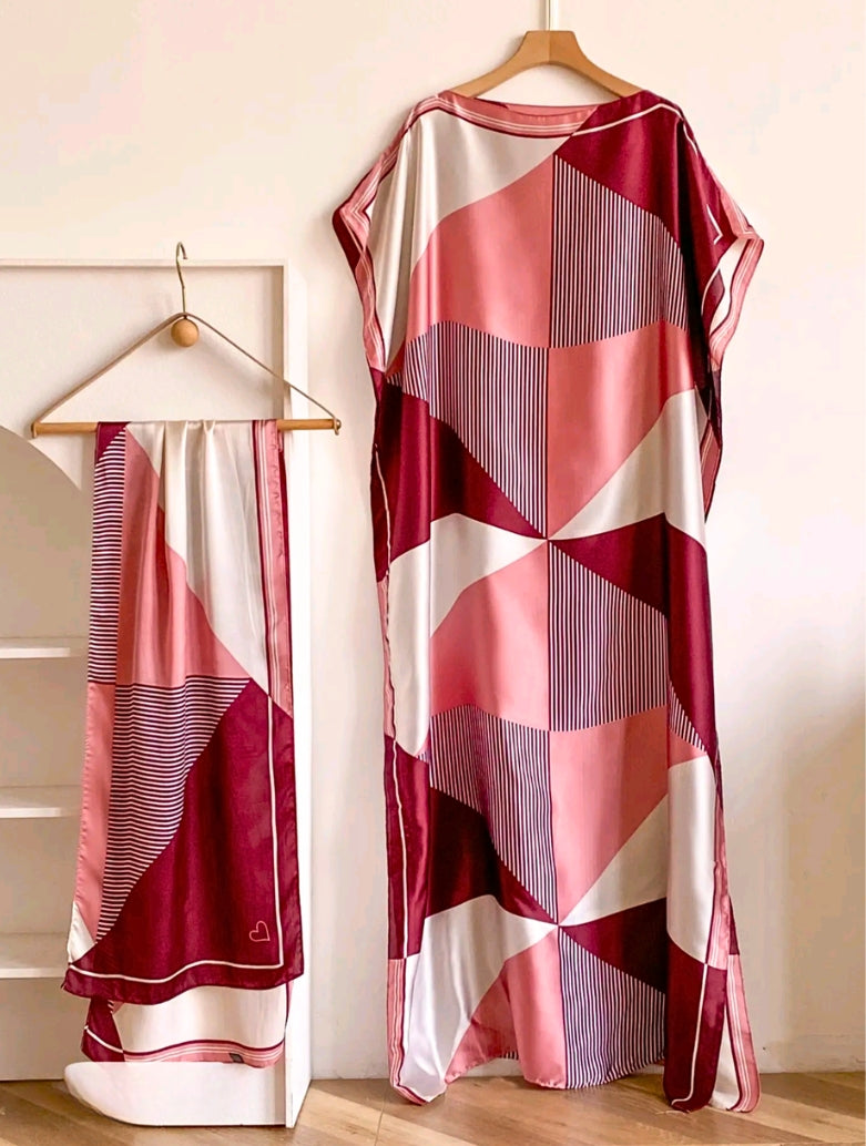 Pink Burgundy Abstract Vibes Silky Kaftan Dress With Belt/Scarf