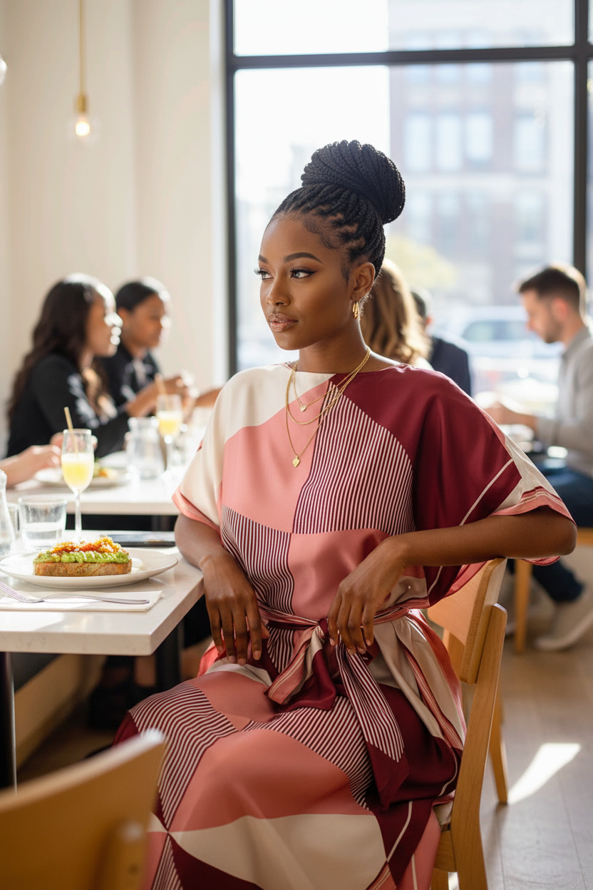 Woman in a pink kaftan dress sitting at a table in a restaurant.
