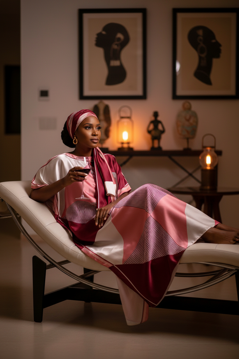Woman in a pink kaftan dress sitting on a chaise in a room with framed art and decorative items.