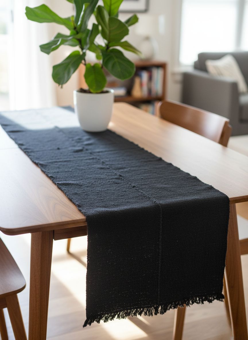 Dieser schwarz-weiße Tischläufer aus Schlammstoff ist 88 Zoll lang und 12 Zoll breit und eignet sich ideal für die meisten Esstische.