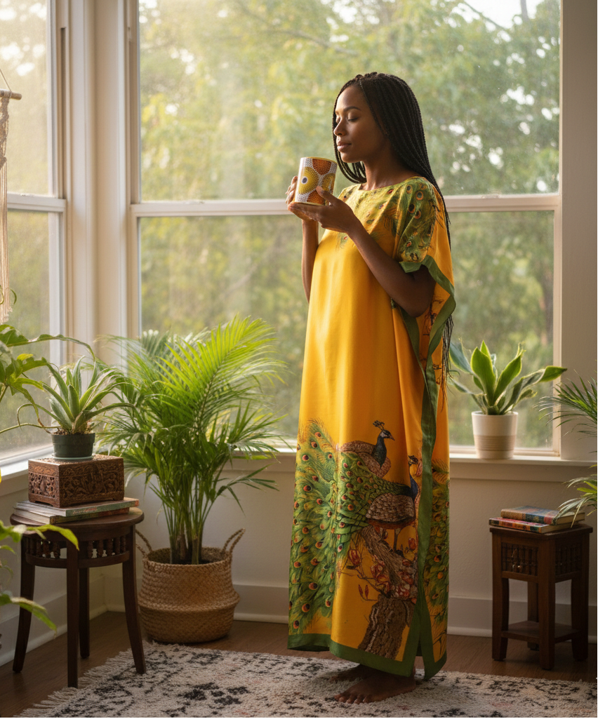 Vibrant green peacock motifs grace the collar and hem against a warm orange backdrop, delivering timeless elegance suited to relaxed days and tranquil evenings.