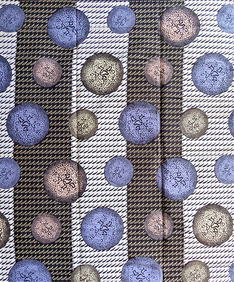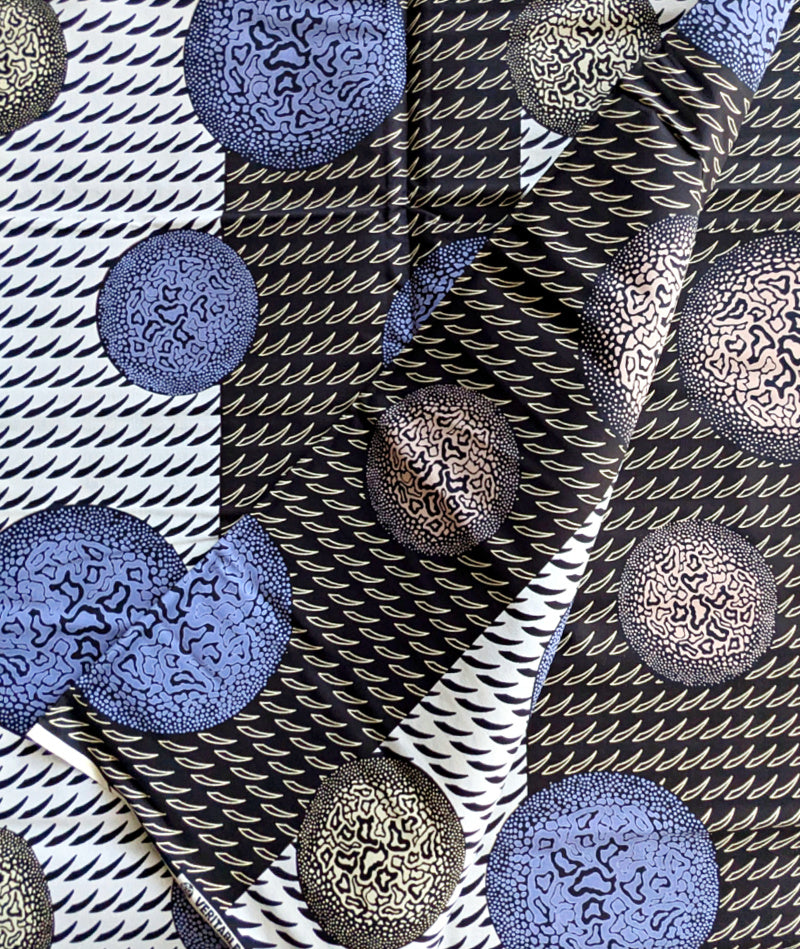 It's time to explore with our 2-yard planetary African print fabric that showcases a captivating pattern of blue and beige planets set against an abstract black and white background.